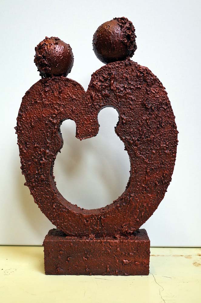 Ze maakt ruimtelijk werk, figuratief en abstract, met behulp van piepschuim en Keracoat.